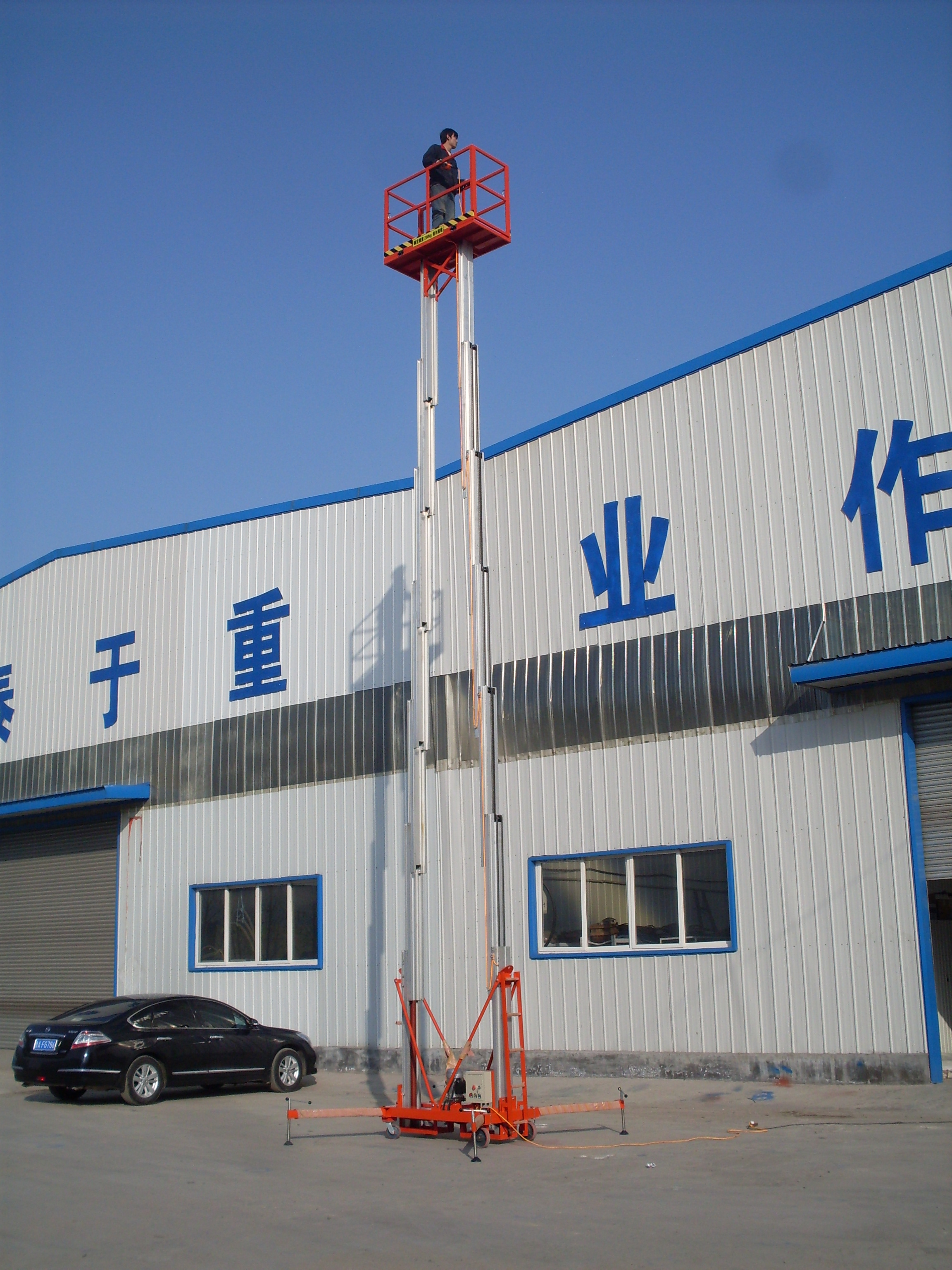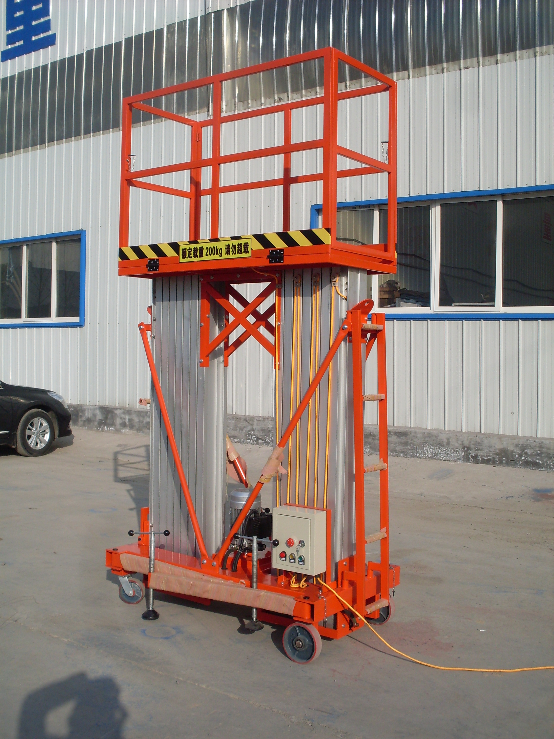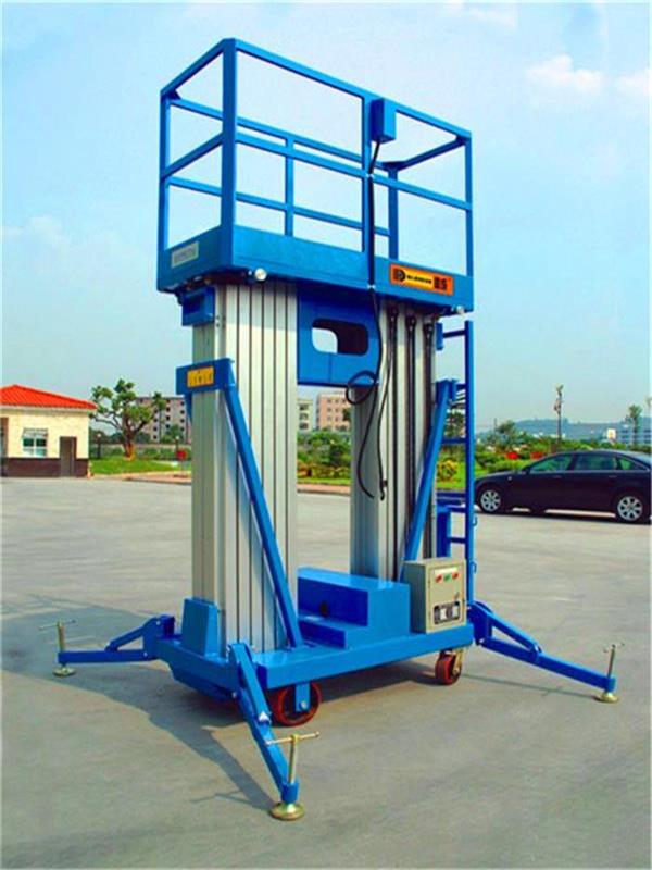 双柱桅柱式升降平台采用高强度优质铝合金材料,具有造型美观、体积小、重量轻、升降平衡、安全可靠等优点,广泛用于工厂、宾馆、餐厅、车站、机场影剧院、展览馆等场所,是保养机具、油漆装修、调换灯具、电器、清洁保养等用途的最佳安全伴侣。
