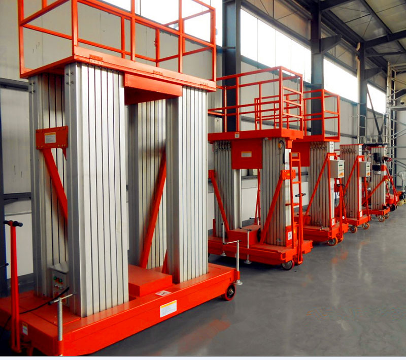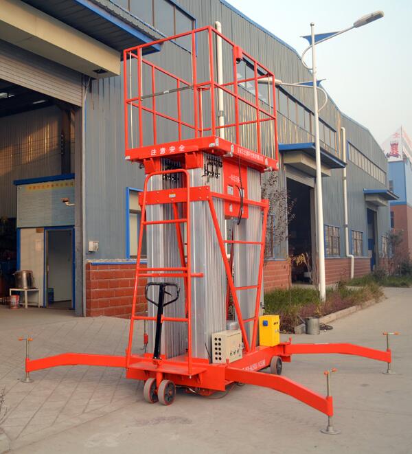 高强度铝合金桅柱升降平台,整机重量轻,机动性好,适合单人操作;特制的桅柱间导轮装置升降平稳自如;结构紧凑,运输状态尺寸小,可进入一般的轿厢以及能顺利通过门洞和狭小通道;双重保护的支腿结构,工作更安全,且可贴近工作面升降作业。